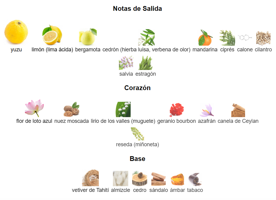 L'Eau d'Issey Pour Homme de Issey Miyake es una fragancia de la familia olfativa Amaderada Acuática para Hombres. L'Eau d'Issey Pour Homme se lanzó en 1994. La Nariz detrás de esta fragrancia es Jacques Cavallier Belletrud. Las Notas de Salida son yuzu, limón (lima ácida), bergamota, cedrón (hierba luisa, verbena de olor), mandarina, ciprés, calone, cilantro, salvia y estragón; las Notas de Corazón son flor de loto azul, nuez moscada, lirio de los valles (muguete), geranio bourbon, azafrán, canela de Ceylan y reseda (miñoneta); las Notas de Fondo son vetiver de Tahití, almizcle, cedro, sándalo, ámbar y tabaco.